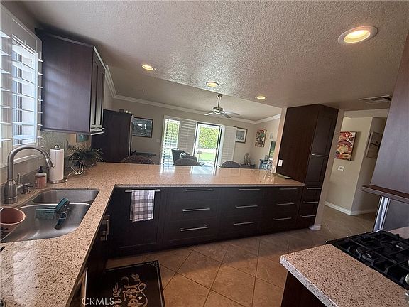Pristine drought-tolerant landscapingOpen layoutStylish quartz countertopsSense of privacyCovered patioElegant warm-toned kitchen cabinetry