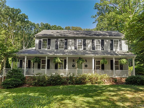 Nestled on a quiet street in the heart of Midlothian, this charming 4-bedroom, 2.5-bathroom colonial offers a perfect blend of comfort and convenience. Located in the desirable Queensmill neighborhood, this home is close to top-rated schools, shopping centers, restaurants, and easy access to Route 288. Exterior Features: Well-maintained cedar siding and vinyl shutters (painted and installed 2017). Sprawling full country porch with freshly stained deck, wooden accent ceiling, and two entrances to either the kitchen or foyer. Beautiful mature landscaping and plantings surround the park-like yard. Fenced-in backyard backing up to a private, unbuildable lot. Remodeled screened-in porch with new screens, composite decking, and vinyl-wrapped posts (2021). Long, oversized paved driveway (resurfaced in 2021) leads to the two-car side-load garage. Garage features a newer Apple door Wi-Fi system (2018), fully insulated walls with built-in shelves, cabinets, and overhead storage. New gas water heater (2024). Access to crawlspace from either garage or under screened-in porch. Interior Features: Bright kitchen with refaced cabinets, Corian countertops and a cozy eat-in area that opens to the front covered porch. Formal dining room with hardwood floors and crown molding. Formal living room or office with hardwood floors and crown molding. Spacious family room with hardwood floors and a gas log fireplace (chimney relined in 2021), providing access to the screened-in porch. First-floor laundry room with sink and cabinetry. Remodeled half bathroom with raised sink vanity, lighting, mirror, and toilet (2021). Primary suite with hardwood floors, cedar-lined walk-in closet, and remodeled bathroom featuring a raised sink vanity, frameless glass shower with built-ins, lighting, mirror, and toilet (2021). Three additional bedrooms with carpet and closets for storage. Remodeled full bathroom with raised sink vanity, lighting, mirror, toilet, and tub/shower with new tile surround (2021). Walk-up attic for additional storage.