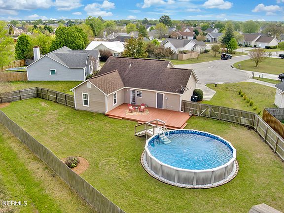 Prime Cul-de-sac location with large, fenced, private yard featuring an inviting above ground pool with lifetime warranty and easy access stairs and landing, fully sodded yard with irrigation in front, side, and rear of the property, plus a shed and an ample deck which extends the entertaining area... truly an oasis! Additional upgrades and bonuses include... HVAC 2018, Gutters, whole house generator hookup and laundry hookups in garage. Direct access to deck, pool, & yard from garage. Partially floored attic space for storage Stainless appliance including Frigidaire Dishwasher and Range and Samsung Refrigerator, tile floors in both baths and kitchen, laminate floors in primary living area, carpet in bedrooms,. Bright and open floorplan with split bedroom layout.