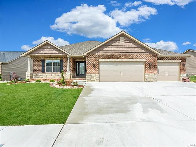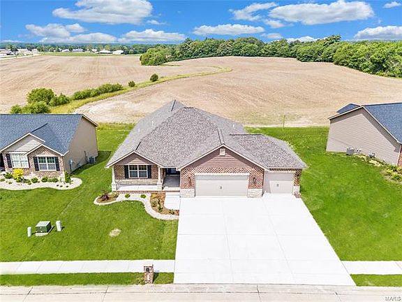 Don't miss out on the newest Quantum Homes spec, which is a superbly built 1-story featuring a split bedroom floor plan, lookout basement, and oversized 3 car garage. Great room boasts cathedral ceilings, gorgeous gas fireplace as a focal point, and lots of natural light. Kitchen features custom cabinetry, large center island, granite countertops, pantry, and appliances include stove/oven, microwave, and dishwasher. Kitchen also has attached dining area with access to the covered deck perfect for grilling and enjoying spectacular country views and amazing sunsets. COREtec luxury plank flooring throughout the main areas. Master suite is spacious at 17x14 a large walk-in closet and attached master bath with double bowl vanity. In the walkout basement, the options are endless and offer the potential for a 32x20 family room, rough-in for a 3rd bath as well as a potential 4th bedroom. Brick mailbox included.