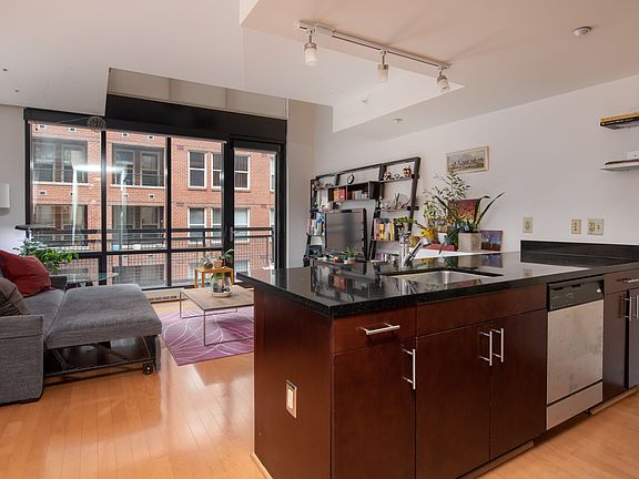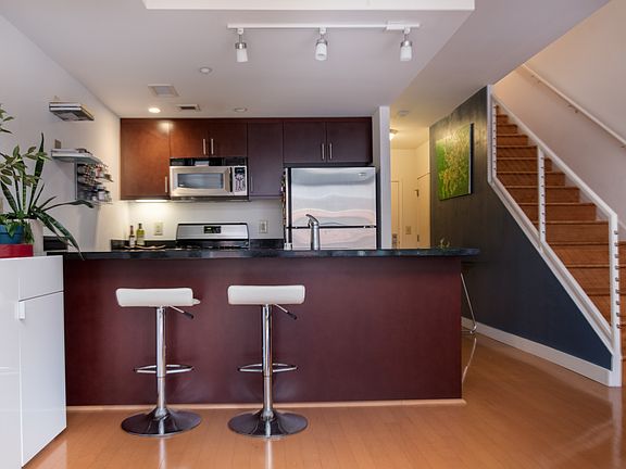 Modern and sophisticated 2 level living in Ventana Condominium. Main level features an open floor plan with soaring two story ceilings and a wall of windows, a gourmet kitchen with large breakfast bar for entertaining, and a half bath. The upper level features the bedroom suite with sitting area, huge walk in closet, luxurious bathroom with double vanities and laundry. Other features include hardwood floors throughout, electronic remote controlled blinds, large balcony and fresh paint. Nearby rental parking. The Ventana Condo features a concierge, upscale lobby, library, exercise room and roof deck. Centrally located the home is convenient to multiple Metro stations, Capital One Arena and tons of restaurants and shopping.