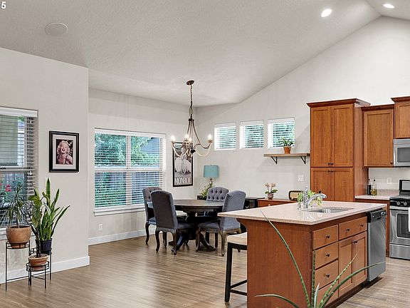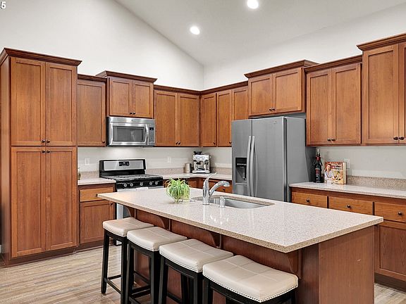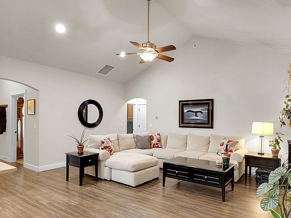 Beautifully designed single level home built in 2016, ideally located close to schools and parks. The open great room features vaulted ceilings and a gas fireplace, creating a warm and inviting space. The kitchen is equipped with custom cherry cabinets, granite counters, an island with an eat-in bar, and a pantry. The spacious primary suite includes dual sinks, a tiled walk-in shower and walk-in closet. Outside, the private backyard is a true highlight with an outdoor kitchen area, covered patio, and plenty of room for entertaining. Additional features include a fourth bedroom or office, RV parking, and a landscaped, fully fenced yard with garden space and an outbuilding.