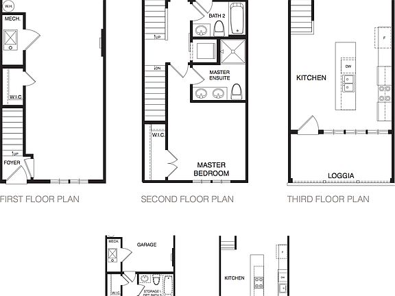 The Welkin floorplan at 4Forty4 features top-floor living with desirable design features including vaulted ceilings up to 14 feet and oversized casement windows providing natural light and city views in select units. The gourmet kitchen features a 10 foot island with quartz countertops, and the top-floor kitchen and living areas spill onto the covered loggia, offering an outdoor entertainment setting. Hardwood stair treads and hard surface flooring run throughout the main living spaces. The middle floor features two bedrooms and two baths, with storage space and a garage on the first floor.