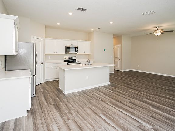 This new construction, 2,260-square-foot rental home in Ruskin offers four bedrooms and three bathrooms. The dining room feels very welcoming and charming with its vinyl plank flooring and high ceiling. It also features a sliding glass door that brings in natural light and gives you easy access to the patio and yard. In the kitchen, several overhead lights shine down on the stainless steel appliances and white quartz countertops. You'll likely get a lot of use out of the center island and walk-in pantry. Upstairs, the main bedroom gives you a nice place to relax. Along with a carpeted floor, it has a lighted ceiling fan, spacious walk-in closet, and well-appointed en suite bathroom. Call to schedule a showing.