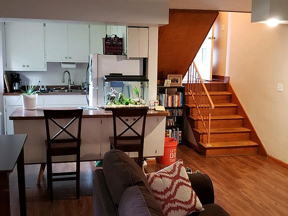 Mature quiet neighborhood is the perfect location for this split-level duplex. Close to public transportation and minutes from downtown campus and majority of all the town has to offer. Parks with summer music and some other areas of interest within walking distance. Two bedroom 1 bath hardwood and laminate throughout. Over 1000 square feet with additional full-length hallway storage. Attached 2-car garage laundry and large yard are shared. Pets considered with additional deposit. owner pays sewer. Tenant has