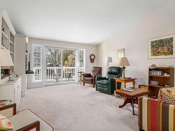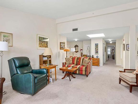 In the heart of Chatham; a wonderful warm and welcoming condominium community offering a social independent lifestyle for ages 62+. Feel right at home in this large well cared for condo with terrific natural light coming from all angles; sliders, oversized windows, skylights and cathedral ceilings. Perfect floor plan with open kitchen, large living room, tasteful built-in shelves and TV space. Great size bedrooms and baths. Sip your coffee while listening to the birds and smelling the flowering bushes on your private deck. An automatic retractable awning can protect you from the rain and sun extending your outdoor experience. Plentiful clean, white cabinets and appliances adds desirability and function. A sizable primary suite with a private full bath and a comfortable guest room with its own bath. Tastefully appointed common areas; living room, dining area, library, and solarium offer opportunities to socialize, entertain or just a change of scenery. Walk the beautiful grounds or take a quick stroll to everything Chatham offers including shops, churches, and restaurants. You will feel safe and secure with 24 hr. concierge service, covered attached garage and emergency pullcord