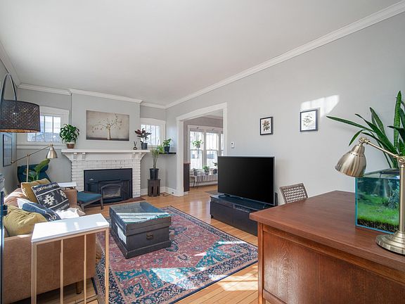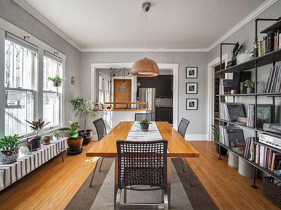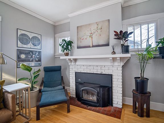 Your welcoming front porch will bring you into thischaracter filled home. The living room is filled with natural sunlight,hardwood floors and a beautiful wood burning fireplace. That area opens upinto the large formal dining room. Functional kitchen includes the appliancesand has a modern feel to it. There is a small breakfast bar between the kitchen& dining. The 2 bedrooms are separated by a full, updated bathroom whichhas a shower over a tub and storage shelf in the shower. Downstairs you willfind a rec room w/bar & full bathroom w/shower. The yard is fenced in andthe location is close to schools, parks, & aquatic center. Updates include roof,gutters, chimney, chimney liner, wood burning insert, fenced yard, waterheater & refinished hardwood floors.