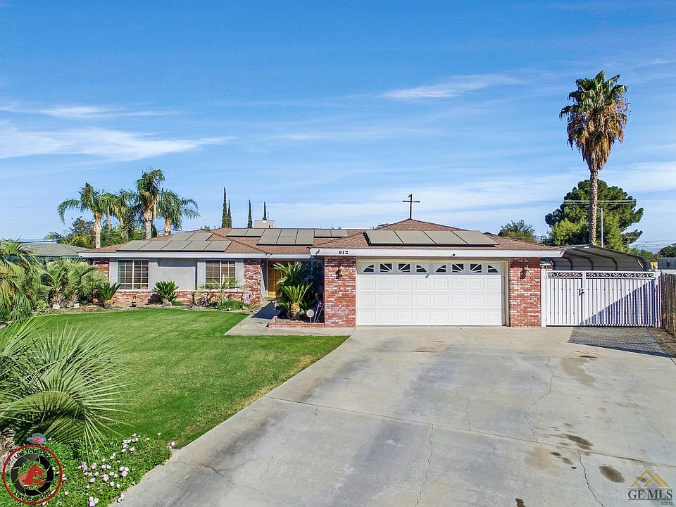 Step inside this 3-bed, 2-bath home in Greenfield, that sits on an oversized corner lot in a quiet cul-de-sac neighborhood. Looking at the front of the home, you will notice the XL front yard, mature landscaping, and the white rod-iron RV gate. Heading inside, the living room has tan carpet, a gas fireplace, and two ceiling fans. The kitchen comes with lightly-colored wood cabinetry, tile countertops, tile flooring, a breakfast bar, and a dining area. Each bedroom features large windows, spacious closets, and the master has a door leading to its private patio area. Both restrooms are equipped with tile countertops and large vanity mirrors. The indoor utility room has plenty of storage space. In the backyard, there is a covered patio area, XL grass area, storage shed, carport for additional parking, and partial block wall fencing. The solar system is a PPA and there are 27 panels. Schedule your private tour, before it sells! (Some photos may have been digitally enhanced.)