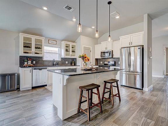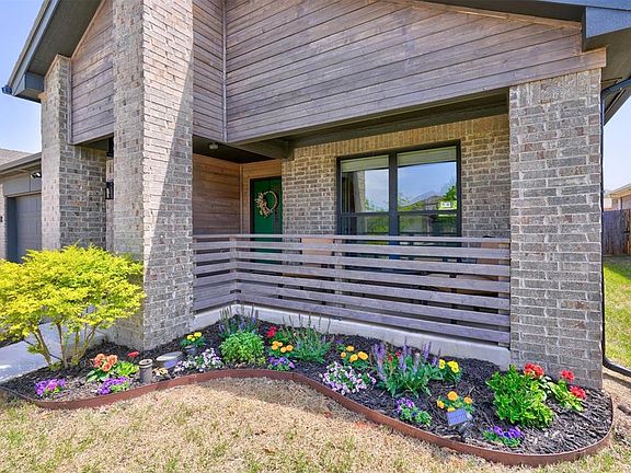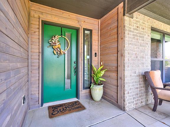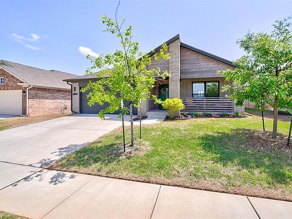 Absolutely stunning Modern Contemporary masterpiece located in the fabulous Greenleaf Trails Addition! A wonderful, family-friendly neighborhood that features great parks, splashpads, walking trails and more! You will love the fabulous curb appeal of this unique custom design, beautifully highlighted with rustic accents, exquisite landscaping, and inviting covered front porch. Welcome home to a spacious split floor plan featuring tall ceilings, bright windows, stylish light fixtures, cool gray colors, and woodgrain tile flooring. A gorgeous open kitchen concept, complete with large island, breakfast bar, quartz countertops, glass tile backsplash, big pantry, matching appliances, and white kitchen cabinetry. The functional family layout also offers a kitchen dining space, large formal dining or flex room and huge private study – just perfect for those working from home! Big primary bedroom and en-suite bath with walk-in closet, double vanities, large soaker tub and separate tile shower. The secondary bedrooms and guest bath are all good sized with big closets and plenty of room to grow. A large covered back patio opens up to a great backyard for the kids to run around in. STORM SHELTER located in the spacious 2-car garage! This beautiful, like new modern contemporary home is conveniently located near great Norman schools, and easy highway access. Ready for a new family to love and enjoy. Welcome home!