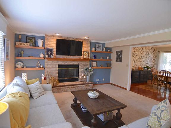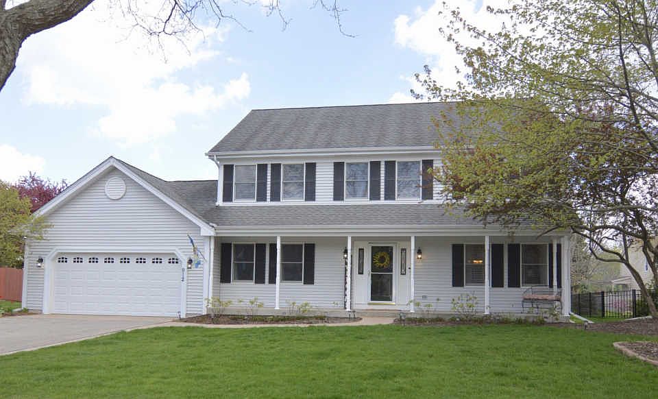 Nothing to do but move in! Beautiful curb appeal from the full front porch where you can relax while drinking your coffee to the flowering landscape, new light fixtures and aggregate driveway ribbons. This home has an updated kitchen and full baths. Gleaming hardwood flooring in the owner's suite and laminate flooring on the first floor. White trim with crown molding & 6-panel doors. Eat-in kitchen offers maple cabinetry with solid surface countertops and tile backsplash, upgraded stainless steel appliances, large center island, and recessed lighting. Sliding glass doors in the eating area lead to the freshly stained deck where you can lounge in the sun or under the pergola. The kitchen opens to family room with cozy brick fireplace flanked by floating shelves. Owner's suite features remodeled luxury bath with oversized shower, freestanding tub, cherry vanity with quartz countertop, lighted mirrors and spacious walk-in closet. All bedrooms feature ceiling fans plus a skylight in the each of the full baths. Finished basement adds tons of living space perfect for an in-law suite or remote learning with a rec room, 5th bedroom, and plenty of storage space including shelves. Spacious lot with beautiful landscaping, outdoor resin shed, deck with pergola, garden beds and a separate fire pit. Oversized garage offers plenty of storage and the workbench is included. New exterior light fixtures, new foyer, office and hallway light fixtures. The flexible floor plan is perfect for entertaining and remote work/school. The first floor den could serve as a dining room, play room, living room, or whatever works for your family.