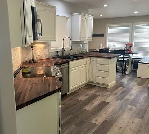 Well taken care of and updated 3 bedroom, 2 bath home. Primary suite has walk in closet, sitting area, large bathroom with double vanity, patio door to covered back porch. Open living room with vaulted ceilings and gas fireplace. There is a dining area and breakfast nook, large pantry. Kitchen has new butcher block counters, new backsplash. New flooring and paint thru out. Recessed lighting thru out. Both baths have been updated. Asphalt driveway with room for extra parking. The fenced backyard is well landscaped, storage shed, great covered patio, mature landscaping, underground sprinklers and a 2 car attached garage.