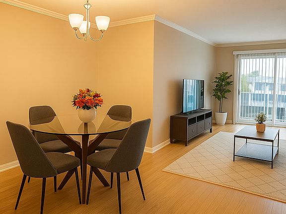 Private balconyAbundant white cabinetsLaminate hardwood-look floorElegant crown moldings