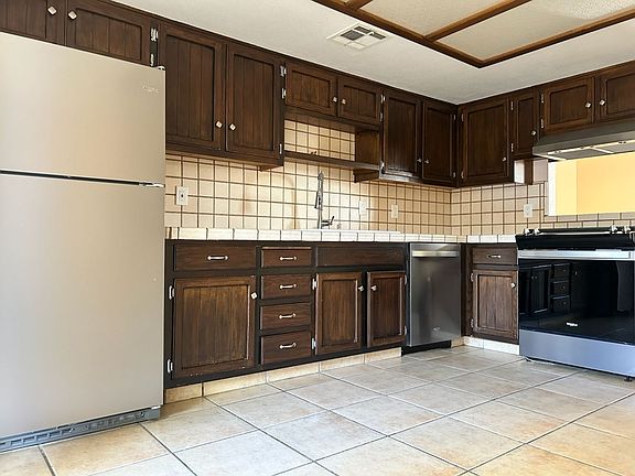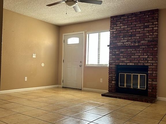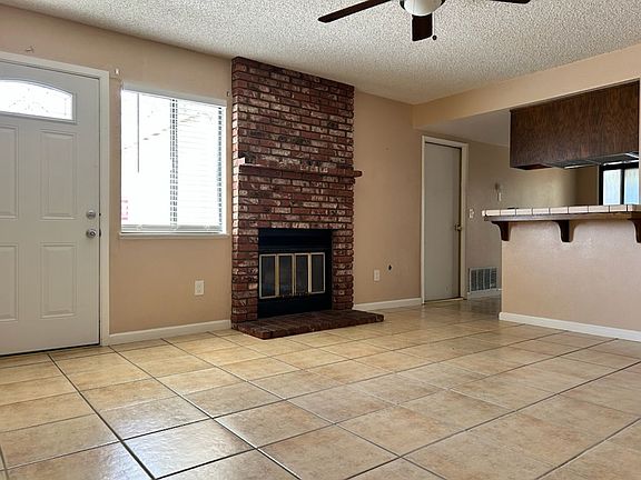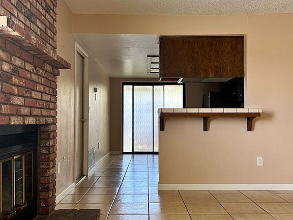 Nice 3 bedroom, 2 bath unit Fireplace in Livingroom Tile flooring in kitchen, living, hallway and bathrooms. Country style kitchen with sliding doors to backyard patio. Carpets in three bedrooms. Two bathrooms, guest bathroom has a white Carrara marble shower surround. Small backyard patio Washer/Dryer hook-ups in garage Evaporative cooling and forced air gas furnace. Refrigerator provided but not warrantied