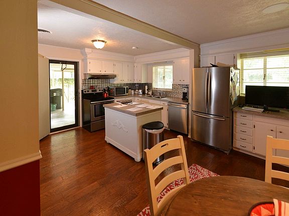 Location, location, location! So close to campus! Quiet street! Large open kitchen area w/ lots of storage. Living rm is adjacent / large & open w/ built-ins & 1 wall of audio visuals. This open up to large concrete deck and big back yard. 4 bed 3 full bath. 2 baths remodeled. Scraped wood floors/ carpet / tile. Zoned heat & Air. Unit in attic just replaced. Lots of additional parking. Garage and workshop have water. All stainless steel appliances stay