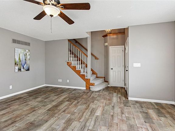 Great home with first floor master and two bedrooms on 2nd floor with a full bathroom. Laundry room (w/d stay) combined with 1/2 bathroom. Open kitchen (refrigerator stays) with island and eat-in area. Large living room with good natural lighting. Basement is finished with ceramic tile flooring and a good size storage area. There is a bar area in the basement for entertaining (not a wet bar). Wood flooring throughout the first floor. Custom stamped concrete patio & fenced large backyard. Great neighborhood - close to Moonlight elementary and walking trails to Stone Creek park.