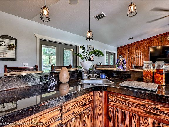 RUSTIC COUNTRY CHARM! If you're looking to escape the hustle and bustle, this beauty fits the bill with its 2.39 acres of pristine land included!! The main house includes 3 bedrooms and 2.5 baths and from the moment you step in from the welcoming front porch through one of the sets of French doors, you'll notice the attention to detail throughout. A great open living area features the expansive living room and kitchen with convenient bar seating, rich, custom wood cabinetry and a walk-in pantry to thrill any chef! Gorgeous hand-made burnt wood barn doors grace all the openings along with trim and accent walls to bring it all together. The spacious comfortable master en suite includes a private bath and walk-in closet. The additional guest bedrooms on the other wing of the split plan are huge and would accommodate a large family nicely along with another full bath. Through the back doors you'll find another relaxing porch that overlooks the pool/outdoor kitchen area and enjoy watching the wildlife that roams freely. The fully detached apartment makes a wonderful guest/in-law suite and boasts a huge living space, 2 bedrooms, full bath and kitchenette, great for all your family gatherings! The fully fenced property also includes a huge workshop/garage with 220v electric service and plenty of loft storage as well. Enjoy exploring your own private paradise including a pond stocked with various types of fish and and a chicken condo with your very own flock. There's also a hookup to keep your RV charged and ready to go. The rock-finish split face block provides strength and ease of maintenance and the reinforced truss strapping gives peace of mind during any storm, also per seller, A/C is only 6 months old! Partially furnished as shown with the exception of a few pieces, artwork and personal items convey with the sale making this one truly "move-in ready". Schedule your appointment to take a look at this gorgeous home today!!