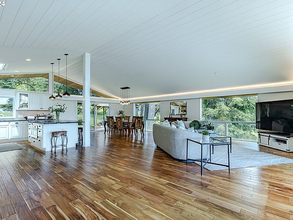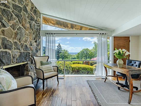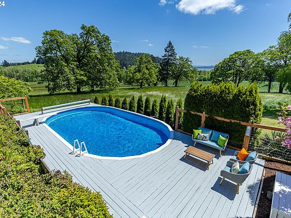Nestled on 20+ acres, this stunning Mid-Century Modern Country Estate offers breathtaking panoramic views of Fernridge Lake and the Willamette Valley. Every room features floor-to-ceiling windows, filling the space with natural light. The remodeled kitchen is a chef's dream with high-end stainless appliances, granite counters, and a spacious island. Updated bathrooms boast quartz, tile, and modern fixtures. Gorgeous wood floors and vaulted ceilings add warmth and character throughout. The lower level offers potential for additional living space with a kitchenette, bedroom suite, and a bonus 1,089 sq ft basement room. Outdoors, enjoy a pergola with fireplace, above-ground pool with private deck, multiple patios, and serene spots to relax. A 2-car carport, 2-bay garage, and shop provide ample parking and storage. Artesian well, low taxes, and just 20 minutes to downtown Eugene.