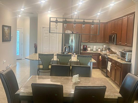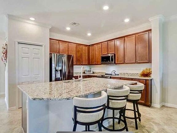 Granite countertopsBeautiful brown cabinetsTile flooringGorgeous designed homeCrown moldingStainless steel appliances