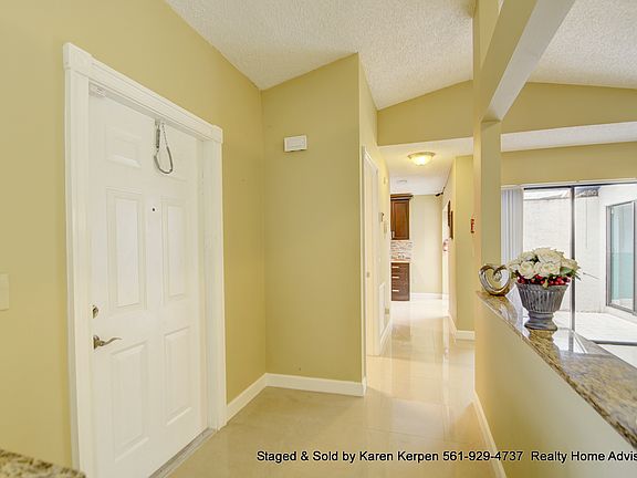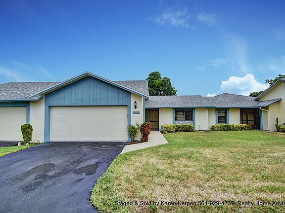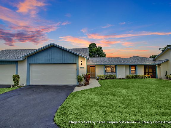 Wow!!!! Updated!!! 3 bedroom/2 bath/2 car garage villa w/the largest floor plan & vaulted ceilings. Featuring large tile flooring the living area and laminate wood flooring in the bedrooms/both bathrooms are updated w/granite counter tops and all the bells & whistles. Cook in the spectacular kitchen w/granite counter tops,glass tile, wood cabinets, ss appliances & more! 5 camera security system comes w/property. 2 outdoor, private & screened in patio areas.New roof from 2012! Entire community just painted exterior! Newly repaved streets! All ages welcome/low HOA fee $290/month includes clubhouse/pool/ Jacuzzi/kids pool/exterior building insurance/community pool/clubhouse/landscaping & pest control. Pets OK up to 50lb dogs!Great schools! FHA ok in community! Staged and Sold by Realtor Karen Kerpen 561-929-4737 Realty Home Advisors