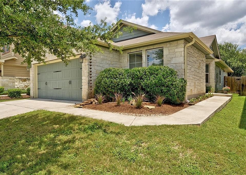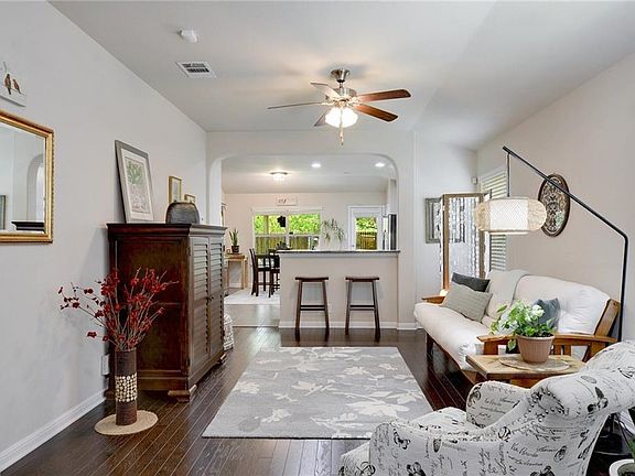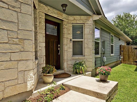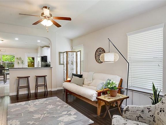 Move in ready home with tile and wood floors throughout. No carpet. Granite counters and tile backsplash in the spacious eat in kitchen. Vaulted ceilings and large windows to let in the natural light. Master bath has a garden tub, separate shower, and a large walk in closet. Large laundry room. Refrigerator, washer and dryer convey. Backyard features a covered patio and drought tolerant zoysia grass. Full sprinkler system. No rear neighbors for extra privacy. Easy access to shopping, IH35, and Mopac.