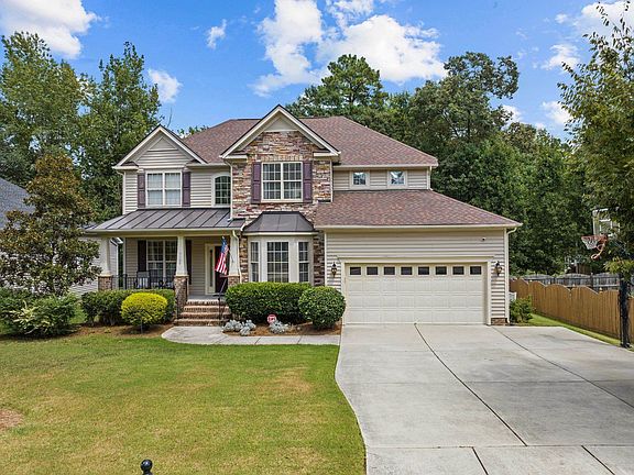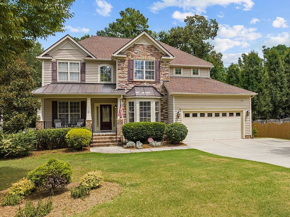 Welcome to this wonderful Wake Forest home with gorgeous stone & siding exterior, bay window bump out, a front porch & flat yard & driveway! Upon entry, you will find a formal dining room & living room—this could also be a reading room, wine tasting room or 2nd office. Thru out the home you will see details such as wainscoting & crown molding--a nod to style & quality craftsmanship. The family room is spacious & lovely! The fireplace provides ambiance & is flanked by built-in bookshelves & cabinetry. The arched pass thru leads to the kitchen making it open concept & also giving each space it's own defined area. The kitchen will be the perfect space for your gourmet creations--you have granite countertops, stainless appliances, an island, lots of storage & a pantry. In warmer weather, enjoy the huge deck, paver patio & fenced in backyard. Upstairs there's a spacious loft (perfect for movie/game night) & 4 bedrooms including the master suite. The master suite has a tray ceiling, two closets, a large bathroom w/ a garden tub & separate shower. The home has been extremely well maintained! Come tour & fall in love!