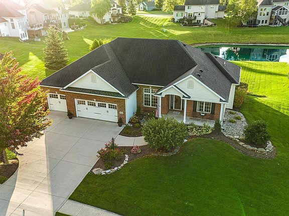 This 2,105 sq. ft. ranch, plus basement home, is absolutely immaculate. It is located in the prestigious Metea Valley Subdivision, in Leo, and features a walkout finished basement with a serene pond view. Beautiful trim work, 10 ft. ceilings, and upgraded poplar woodwork throughout. Custom Amish maple cabinets overlook the dual sided fireplace in the hearth room. The main bedroom features trey ceilings and NEW sliding doors leading to a private trex deck overlooking the lush, large backyard with mature landscaping. Newly renovated master bathroom includes a tiled walk-in shower with custom glass doors, new soaking tub, quartz double vanity, and rich wood planked flooring. Featuring an abundance of cabinets and dual closets for extra storage and a utility sink for convenience, the laundry room is extra large. In addition, the dining, living, and hallway areas have been repainted and new carpet has been installed. There are three large windows in the walk-out basement, which allows for an abundance of natural light. There is a separate vanity/desk area with an oversized mirror and a massive walk-in closet in the 4th bedroom. A two-part shelved storeroom provides plenty of storage. A 90+ furnace, a water filtration system, and a new sump pump with battery backup are included. There is additional workspace in the large 3-car garage and a pull-down attic with more storage space. There was new landscaping done in the front yard in 2021. This home has a security system on windows and doors, and a surround sound system in the basement as well. Cedar trim on the front of the home was repainted this summer, New exterior doors and many windows have been updated. There is a beautiful pool and walking trails in the subdivision.
