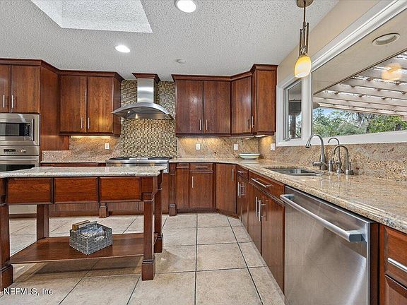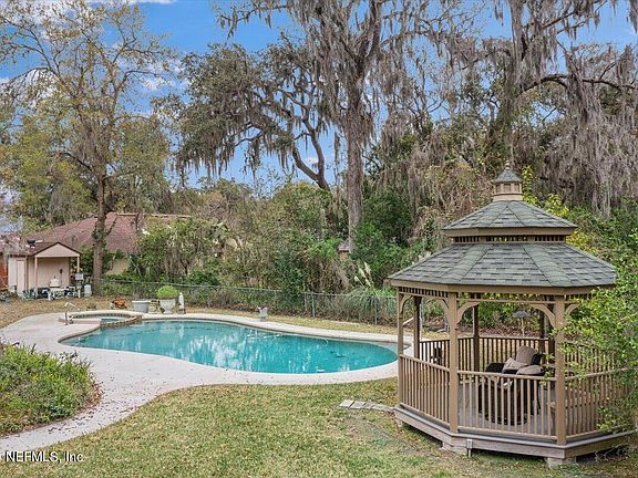 Bring your personal touch to this 6-bedroom, 4-bathroom home near St. Johns River, designed for comfort and entertaining with a gourmet kitchen, fireplace, and outdoor pool with a spa and gazebo. A perfect blend of sophistication and tranquility. Situated on almost one acre and in a serene neighborhood filled with opulent homes. This delightful residence epitomizes sophistication. Designed for effortless hosting, the single-story layout showcases a gourmet kitchen equipped with a spacious island seating five, a GE Monogram gas cooktop, brand-new stainless steel side-by-side refrigerator, wine cooler and more. The family room, adorned with Rosewood walls and a fireplace, seamlessly flows into the expansive Florida room, a versatile space for gatherings, games, or serene evenings. Step outside to unveil a captivating pool area featuring a heated spa, two new pool pumps and a charming gazebo, forming a secluded with its own bathroom. The owner's suite is a retreat in itself, offering ample closet space, built-in drawers, and a dedicated area for shoes and accessories. The library features a wall of bookshelves and a loft with a ladder, creating a whimsical space for the young ones to explore. Bedrooms 3 and 4 share a Jack & Jill bathroom with double sinks and a step-in shower. Wider hallways and bathroom entrances make is easy for wheelchair access. The property is complete with a long driveway providing ample parking for guests and a 2-car garage with a workbench, storage cabinets, and additional space housing the water softener and water heater. Also two sheds in the backyard.