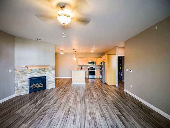 Key Features: Nine-foot ceiling Vinyl plank floor in living room, hallway, kitchen, and bathrooms Full size in-unit washer and dryer Spacious living room with gas fireplace and ceiling fan Breakfast bar Maple kitchen cabinet Stainless steel refrigerator with icemaker, dishwasher, range, microwave, and garbage disposal Dining room Master suite with walk-in closet and Maple cabinet with double-sink cultured marble countertop in master bath Two extra bedrooms Carpet flooring in all three bedrooms Gas forced air furnace Central air conditioning and heating Fire sprinkler system Two car attached garage Concrete driveways Cultured stone exterior Lawn care, snow removal, and private curbside trash collection