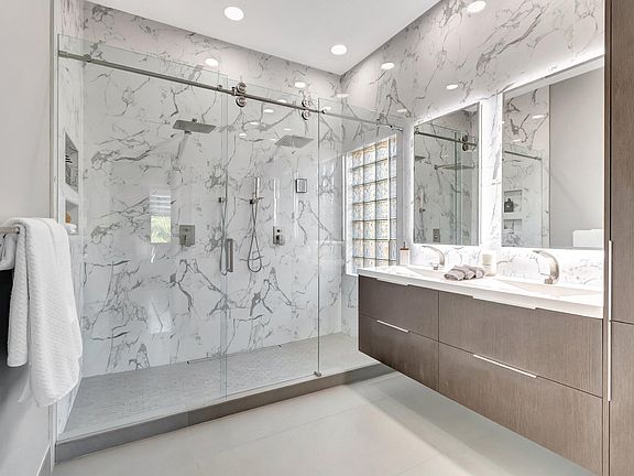 The flexible layout includes a first-floor bedroom with double doors and slider access to the patio, making it ideal for an in-law suite or home office. The guest bath is a showstopper, showcasing custom floating cabinetry, high-end porcelain wall surrounds, a large rain shower, and a seamless glass enclosure.