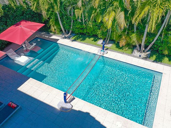 Experience EYE-CATCHING RENOVATIONS and modern luxury from the moment you arrive. A widened driveway & fresh curb appeal set the tone for this stunning contemporary home. Step into your private backyard paradise featuring a 2019 heated saltwater pool with a water feature, LED lighting, and a large sun shelf with room for two chaise lounges, bubblers, and a prebuilt umbrella pocket--perfect for a relaxing Florida afternoon. (lounges, table & umbrella excluded). Lush mature palms and clusia hedges create a serene tropical retreat. The pool area features Artistic Shellock pavers, combining luxury durability and functionality. With their cool-to-the-touch, non-slip surface & high-strength design, they enhance curb appeal while providing a safe, stylish, & low maintenance outdoor living space. The side yard is thoughtfully designed with turf and pavers for a clean, modern look, and a 6' x 4' storage shed keeps your outdoor essentials organized.