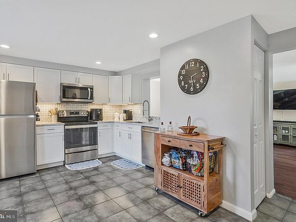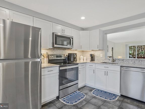 BEAUTIFUL 3 level townhouse with recent updates. Renovated kitchen in 2020 with white cabinets, quartz counters, tile backsplash and floors. Stainless steel appliances. Recessed lighting. Kitchen has a nice eat-in area and pass through with a breakfast bar. Updated half bath. Spacious family room with ample room for separate dining table or even a home office area. Newer LVP (2022) flooring. New sliding door off the family room to a new (2022) deck overlooking fenced yard and patio area. Backs to wooded common area. Upper level boasts 2 LARGE bedrooms, and the primary has direct access to the remodeled bathroom. Bedroom carpet replaced in 2022. Lower level offers a full bath, large laundry and storage area and a rec-room or optional 3 bedroom with a generous sized closet. Rear entrance walk-out to yard. Roof less than 6 years, Newer HVAC. -- too much to list it all!