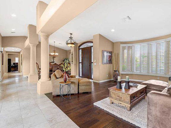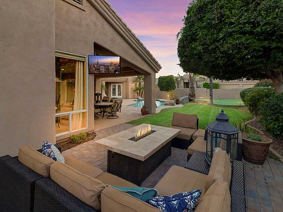 Situated on a corner lot in a small gated community, this perfectly landscaped and meticulously maintained property at 9128 E Wethersfield Rd is showing off its curb appeal with fresh paint and stucco. This custom spec home is being sold by the original owners and is sure to check every box on your wishlist! A 3 car garage with ample parking space in the driveway is one of the first things every buyer will love about this home, and there's even more to love once you're inside! A formal dining room, living room, plantation shutters, a stunning combination of travertine and hardwood flooring, an abundance of natural light and sky high ceilings greet you upon arrival and an open concept feel is present throughout the home while still offering distinction between the most enjoyed areas.(MORE!) Oh, and did we mention the poolside views nearly everywhere you turn? As you make your way through the home, there's a second cozy living area with built-in shelving made of recycled beams from an 1880's barn in the Sierra Nevada mountains in CA. The mantle is solid oak and the trim accents are wormwood from the Puget Sound WA circa 1900's. The best views of the pool are found in the heart of the home, the kitchen; where you'll appreciate tons of cabinetry for storage, plenty of counter surface to put to use, and a pantry. The master bedroom is expansive and features backyard access through french doors, ample closet space, and a sizable master bathroom with separate shower and jacuzzi tub. Your future backyard oasis will be ideal for entertaining or just enjoying AZ life with your putting green, pavers, mini garden, updated pool with rock waterfall, gas fire pit and covered patio! The community has even more to offer when it comes to amenities, including a sports court in the common area and the location can't be beat! Enjoy being a few minutes from the 101 freeway, and just beyond that there are endless options for shopping, entertainment and dining. It's time to make this place yours! Schedule a showing today and get your offer in while there's still time! (3D Matterport Virtual Tour Available in photos tab on the upper right hand side)