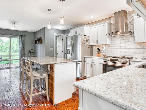 This stunning 3 bed/2-bathroom ranch on 1.34 acres has been completely remodeled inside and out gradually since 2016. The property has a long driveway leading to the covered porch and 3-car garage with workshop. Enter the foyer with views of the stainless-steel custom kitchen, center island with quartz countertop, barn door to pantry, gas stove, hardwood flooring and slider to the back deck. The living room has a wood burning fireplace with mantel, large picture window and hardwood flooring. The larger 3 bedrooms have carpeting and the whole house enjoys new double pane windows. There is one bathroom near the bedrooms with quartz countertop, custom cabinetry, new hardware, tile flooring, tub, and shower.