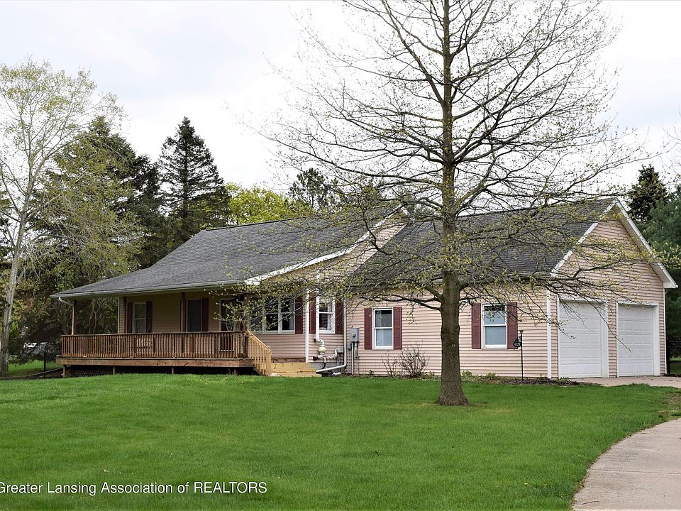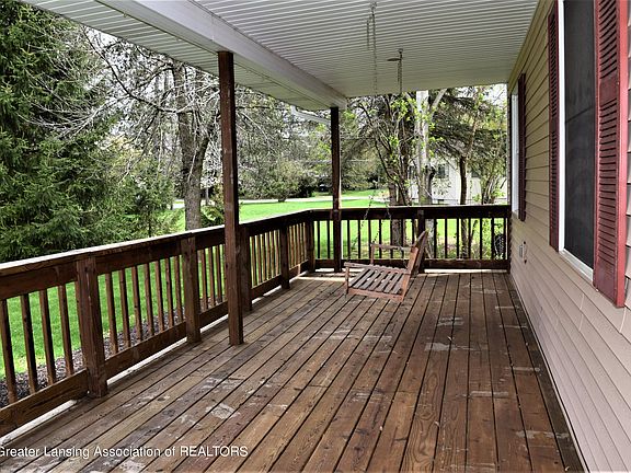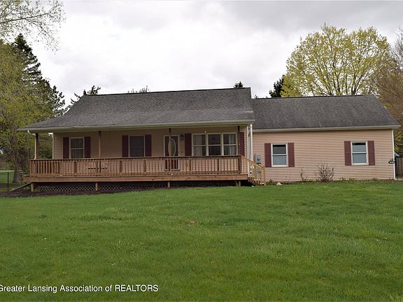 Welcome to Riverside Dr. and the Brookwood subdivision! Wind along the Looking Glass River, discover beautifully maintained homes on large country-sized lots with mature landscaping & friendly faces. Just a few minutes to I-96 & I-69 making a commute to Lansing or even Grand Rapids quick and easy. 15 minutes to the Capitol! This 4 bedroom 2.5 bath ranch is ready for a new owner. Step up on the 38 ft. covered front porch. The ideal place for summer get-togethers. Inside offers a well organized open floor plan. Rich wood look flooring throughout most of the main floor. The living room has lots of natural light, cathedral ceiling & plenty of wall space for furniture, artwork & the Big Screen! Into the dining area & kitchen beyond. Honey oak cabinets, neutral counters, new SS refrigerator & dishwasher. Slider to incredible new 12 x 12.6 ft. composite deck! New vinyl coated (black) fencing in the backyard. Storage shed for mowers & garden materials. Room for year round play. The combination laundry room-half bath provides additional kitchen storage, folding counter or a quick bathroom break! Top of the line 1 yr. Maytag washer & dryer stay. Down the hall to 3 bedrooms. The primary overlooks the backyard. Private 3 piece bath, double closets & neutral paint color combine to make this a very comfortable space. Both additional bedrooms have ample closet space, neutral wall color & wood look flooring. The main bath has a tub-shower combination, vinyl flooring & oak cabinetry. 4 ft. wide stairway to the lower level features a nicely finished 23 ft. family room. Newer plush carpeting, built-ins, indirect lighting. Room for entertaining or just family fun. The 4th bedroom has 3 large egress windows with decorator blinds, mirrored closet and additional space for office furniture or a sitting area. Recent updates: 90+ furnace, hot water heater, vinyl fenced backyard, composite deck & stairs, refrigerator, washer & dryer, landscaping including thinning the wooded barrier along the road. 2+ car attached garage with storage alcove. Maint. free vinyl siding. Come see for yourself, you'll fall in love!