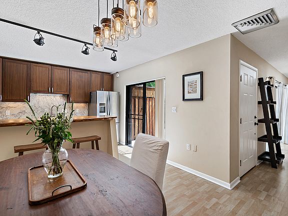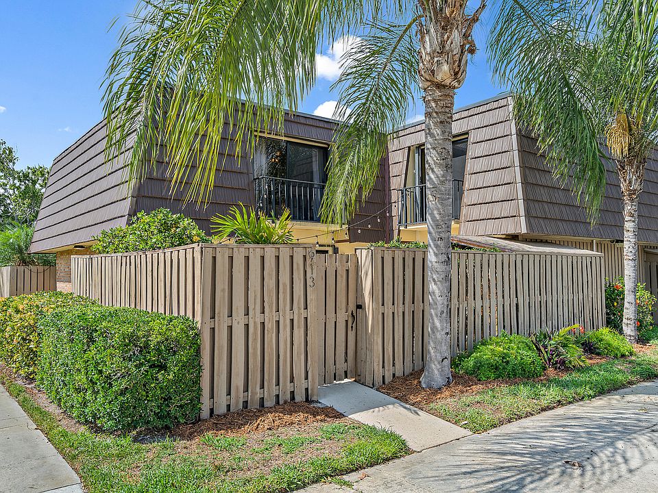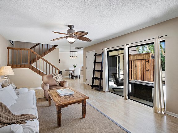 Divosta 2/2.5 townhome in the heart of Palm Beach Gardens! Completely renovated top to bottom! Beautiful stained concrete flooring from the staircase leading into the upstairs bedrooms. Popcorn ceilings removed, wiring hidden for master bedroom fan, dimmable track lighting added to kitchen bar and spot lighting added to staircase. This unit is perfectly placed within the court to allow your designated parking spaces to directly back into the patio for convenient access. Accordion storm shutters on all four of the sliding glass doors for quick, easy hurricane protection. Custom walnut soft-close cabinets, granite countertop/backsplash, stainless steel appliances and a live-edge pecan bar top. Relax on the enclosed patio with a move in ready unit. 2020 AC unit, 2021 roof, 2022 water heater.
