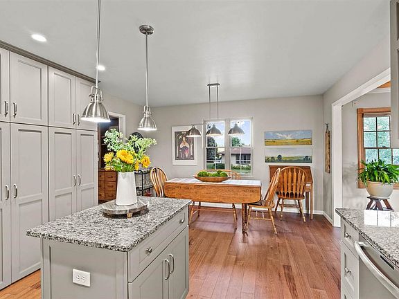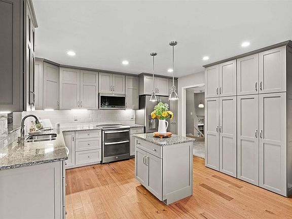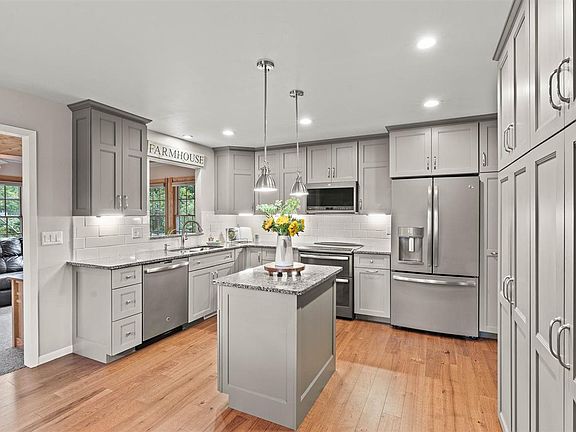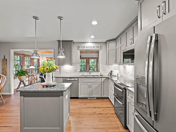 Exquisite 1 owner home surrounded by mature trees and lovely landscaped grounds. This tasteful 3 bedroom, 3 bathroom design is enhanced with many recent updates including painted white trim & doors. The custom kitchen is very chic with gray soft close cabinetry, island, granite counters, pantry, stainless appliances, subway tile backsplash & brushed nickle fixtures. Main floor sunroom, dining area, large living room and spacious primary bedroom suite with walk-in closet and primary bathroom. 2nd bedroom includes a walk- in closet. Lower level family room with gas fireplace boasting floor to ceiling brick & custom mantle, excellent bar area, bedroom, bathroom, large laundry room with soaking sink and abundant storage space. Full enjoyment of the expansive backyard from the sunroom and walkout lower level with newer maintenance free upper and lower decks. Attached oversized 2 car detached garage with a workspace area. Outdoors you will also find a 12 x 16 garden shed, garden area with rhubarb & asparagus.  This is a must see property.