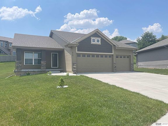 This stunning pre-inspected ranch-style home, built in 2018, is nestled on a tranquil cul-de-sac in Papillion! As you step inside, you'll be greeted by beautiful wood floors that flow seamlessly throughout the main living areas. The open concept design and 9'+ ceilings create an inviting and airy atmosphere, perfect for entertaining friends and family. The heart of the home is the gorgeous kitchen, boasting exquisite cabinetry with glass upper doors, quartz and granite countertops, and a walk-in pantry. The primary bedroom is a true retreat with soaring ceilings and a spacious walk-in closet. One of the standout features of this home is the unfinished basement with rough ins, offering unlimited potential to customize and create your own dream space. This property sits on over a 1/3 acre of land, providing ample space for outdoor activities, gardening, or simply enjoying the fresh air. Bonus features include a laundry room on the main level and a sizeable drop zone. Don't miss this one!