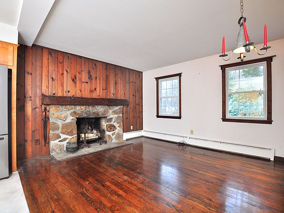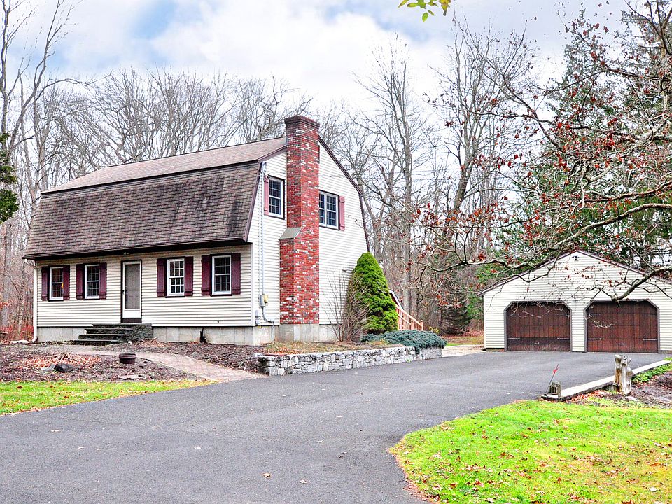 This well-maintained Gambrel Colonial with detached two-car garage and shed is located on a beautiful level 1.68 acre lot. Hardwood floors throughout, except kitchen and baths, even under the wall-to-wall carpeting. The updated kitchen has newer appliances and a moveable center island, and leads to an oversized deck overlooking the private backyard. The room next to the kitchen could be a family room with fireplace or make it a large country kitchen. There's a first floor full bath that's next to the room the owners used as a dining room but it could be used as a den. The large living room is light-filled. Upstairs is a primary bedroom with lots of closet space and two other bedrooms, one with built-ins. A remodeled full bath completes the second floor. The basement is a walk-out. This property is conveniently located close to town, shopping, the library, parks and Rt 67 & I-84. The house is being sold AS IS. Buyers may do inspections for informational purposes only. (There are cameras on the outside of the house).