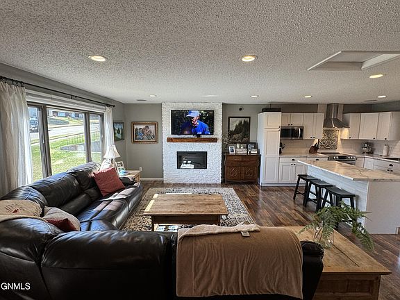 This multi-level home in east Bismarck is one you don't want to miss! Step through the front door into the beautifully updated, open concept kitchen, living, and dining room. Kitchen features newer stainless steel appliances, countertops, and cabinets, with the ambience of an electric fireplace emanating from the living room. A built in audio system covers the main level, all perfect for entertaining. Master bedroom features it's own bathroom with custom tile shower and walk-in closet. Relax and unwind in the large family room or pull up a stool at the custom built bar. Family room and dining room both feature large sliding glass doors which lead to a deck at both exits. While the home brings in a great deal of natural light, the backyard provides the perfect outdoor space for recreation with a large garden plot, space for a fire pit, large mature trees, rosebushes, lilac's, and more, which create your own private natural fencing; gorgeous when in full bloom! 2-car garage has built in storage shelves and there is a shed off of the extra parking pad. This home is located near walking/biking trails, Sleepy Hollow, Hillside park, and Rita Murphy Elementary is right down the street, with Simle Middle School close by. All appliances stay, including the newer washer and dryer. You are sure to love all that this home has to offer. Call for a showing today! Agent/owner
