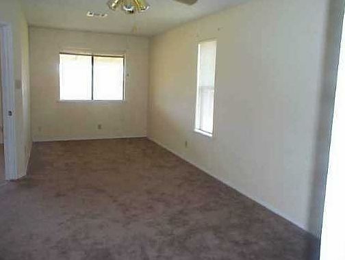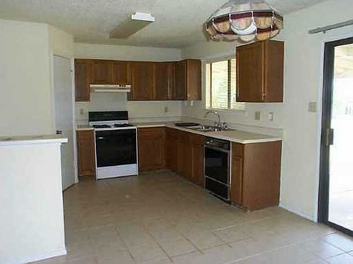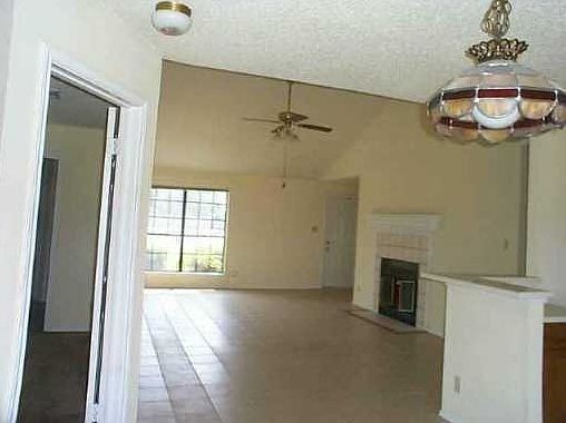 Attractive home featuring high ceilings, cozy fireplace, kitchen, which looks to the living room, three bedrooms and two baths There is hard tile in the living room and kitchen area and newer carpet in the bedrooms. A large covered patio and yard awaits your pleasure for resting and having fun. Fresh paint throughout the house and garage. The two car garage has laundry connections and storage space.
