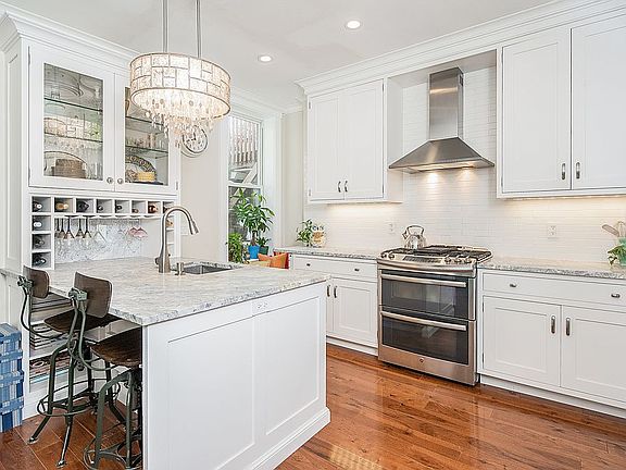 The quintessential classic Hoboken brownstone-style condo has finally come on the market! This incredible two bedroom two bath home was lovingly renovated to blend modern amenities with classic aesthetics. The fully gut renovated kitchen features locally hand crafted cabinets, tons of storage space spanning 42" to the ceiling, additional pull out cabinet, window seat, built in China cabinet w/glass doors, under counter book case, topping it off with an over-sized peninsula breakfast bar featuring honed quartzite and a heavy gauge undermount sink. The all stainless steel appliance package includes a GE 5-burner double oven and hood vent, KitchenAid dishwasher and KitchenAid counter depth French door refrigerator. Behind a custom build barn door is hidden the in-unit fronting load washer and dryer. Expansive living/dining room with built-ins and French doors lead to second bedroom. Crown molding and beautiful 5" hickory hardwood floors throughout. Building offers additional bike storage in basement and a gated storage for this home.