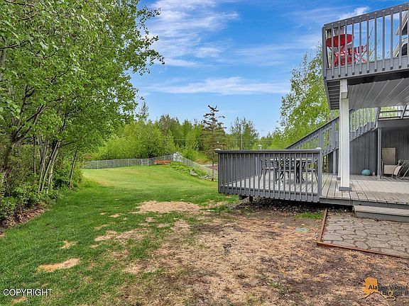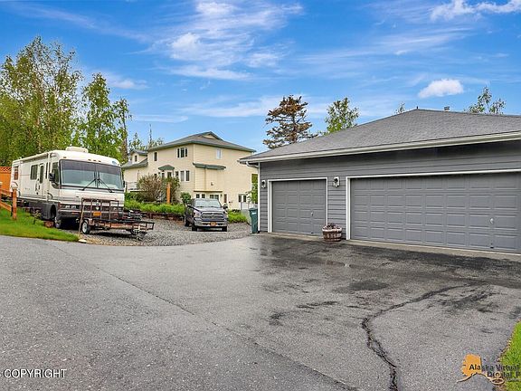 Beautiful 5 Bed,3 bath, 3668 SF w/abundance of windows/natural light. Upstairs has 10 foot ceilings w/ pleasing layout providing grand, spacious flow. 3 beds 2 baths upstairs. Custom double decks w/ stairs leads to huge backyard for summer BBQs. Downstairs has mother in law/income potential & separate family room area w/ pool table that stays-Nintendo Wii ''bowling alley', bar and perfect entertainment and gaming areas. Big 3 car garage, large firepit area, a doggy door that leads to a fully fenced backyard. Generator switch,forced air, gravel parking areas,shed, tons of storage inside this home. Great commute location. The Northern lights are visible in winter as well as Pioneer Peak and surrounding mountains. Incredibly well cared for. Gorgeous home, come check it out, even better in person.