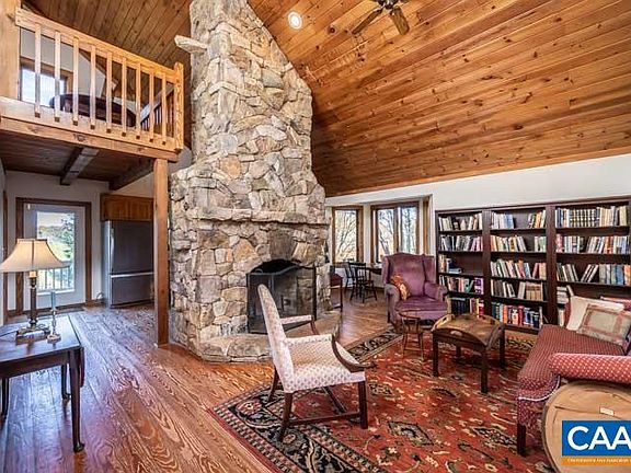 Charming country home on 21 gorgeous acres with stunning views. Private gravel driveway leads you to the homes welcoming front covered deck. When entering the home you will be greeted by 5" pine plank flooring,, great room with soaring ceilings also covered with pine planks, plenty of windows to let the sunshine in to enjoy the views, a massive stone fireplace that soars to the ceiling. The interior of the home has been freshly painted within the last year. New heat pump/AC was installed Nov 2021. New stove being installed. Master bedroom and bathroom on the first floor, upstairs loft is currently being used for an office but could also be used as a 3rd bedroom. New deck has been added just off of the kitchen with stairs leading to the backyard, garden, firepit and trail to the pond and second barn. Bring your horses, donkeys, goats, and chickens! The paddock, run-in barn, 2nd barn near the pond to store tools and hay, chicken coop with attached storage room, and a separate storage shed are all in place. Beautiful country living only just 20 minutes to Scottsville and 40 minutes to Charlottesville. All 3 fireplace flues are cracked and being sold as-is.