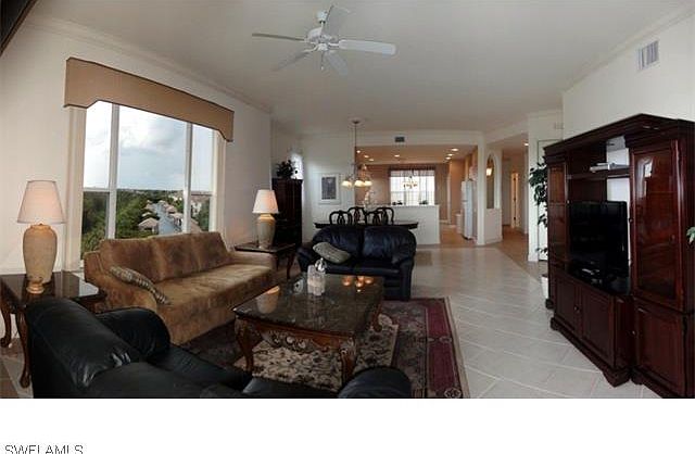 BEAUTIFUL TOP FLOOR PENTHOUSE UNIT 2/2 WITH BEDROOM/DEN. GREAT VIEW OF PRESERVE AND SKYLINE OF FT. MYERS BEACH WITH SUNSETS TO DIE FOR! FRESHLY PAINTED THROUGHOUT, TILE THROUGHOUT INCLUDING LANAI, 10 FOOT CEILINGS, ELECTRIC SHUTTERS ON LANAI, CROWN MOLDING, NEWER DISHWASHER, MICROWAVE AND REFRIGERATOR, JETTED TUB IN MASTER, EXTRA LARGE UNDERNEATH GARAGE AND SELLING FURNISHED! PAY AS YOU PLAY GOLF! TENANTS IN PLACE JAN, FEB AND MARCH 2016! ALSO UNDERNEATH GARAGE RENTED OUT THROUGH JUNE 2016. BUYERS TO ASSUME LEASES.