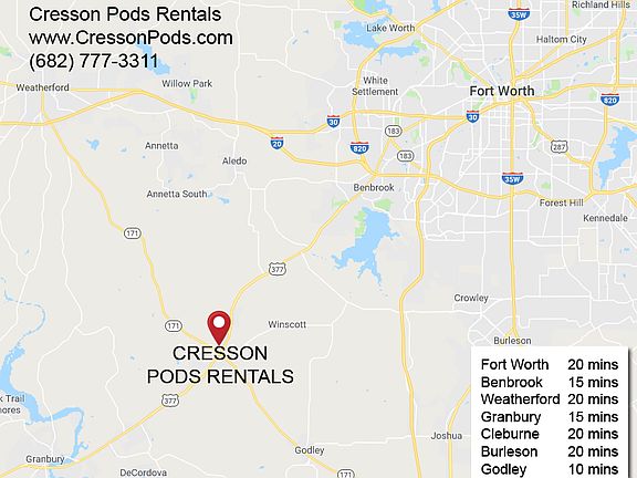 15-20 mins to Fort Worth, Weatherford, Granbury, Cleburne, Godley etc.