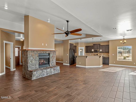 Wonderful Single-Level Home Built in 2016 by Swift Water Builders, LLC. Open Floorplan Features 3 Large Bedrooms, Vaulted Ceilings, Sunny & Bright Great Room, Formal Dining, and a Separate Office (Could be used as a 4th Bedroom). Vaulted Entry & Living Room Showcase a Double-Sided Gas Fireplace w/Native Malpais Stone & Handcrafted Wrap-Around Wood Mantel. You'll Love the Open, Chef's Delight Island Kitchen with Upgraded Cabinets, Pantry, Upgraded Appliances Including a Built-In Microwave and Natural Gas Range, Granite Countertops, Stainless Steel Undermount Sink, Pendant Lighting & Oil-Rubbed Bronze Fixtures. The Wood Plank Ceramic Tile Floors are Gorgeous!! Enjoy the views of the San Francisco Peaks from the Breakfast Dining Area.Craftsman-Style Casings, Window-Sills, Base & Trim.