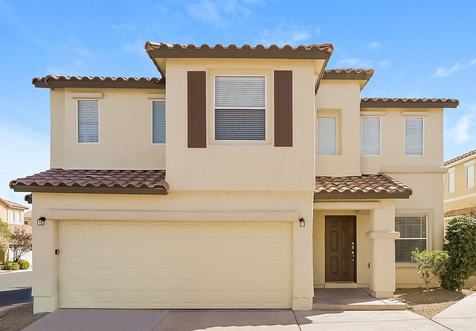 Take a look at this renovated two-story Las Vegas rental home with four bedrooms, one half bathroom, and two full bathrooms. The first level's open floor plan starts in the living room, where large windows with blinds and a lighted ceiling fan promote comfort. Recessed lights and stainless steel appliances offer convenience in the kitchen. Neutral paint and a window add charm to the dining room. Relax in the family room, or use the pair of sliding glass doors for quick access to the patio in the fenced backyard. Upstairs, the primary bedroom's large walk-in closet makes choosing an outfit a breeze. Pamper yourself with a relaxing soak in the private bathroom's garden tub. Tour this smart rental home soon.