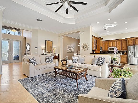 This beautiful Alexandra model has a light and bright open floor plan. The ceilings are 13' with crown molding and double coffers. It sits on a large lot with an expanded patio area. The back yard is professionally landscaped and provides a gorgeous view. There is plenty of room for a pool. The kitchen has double ovens, granite countertops, extra storage cabinets, optional sliding glass door, water filter, and many new appliances. The air conditioner was recently replaced with an ultra high efficiency (23 SEER) model. The air conditioner also has an 5" thick air filter which is a MERV 16 (hospital air quality). The primary bedroom closets have California Closets. The garage has many storage cabinets and the floor was recently painted. The washer and dryer are also new. Live the Valencia lifestyle with many clubs, shows, and sporting activities.