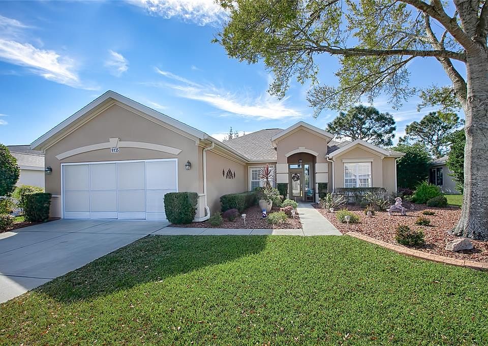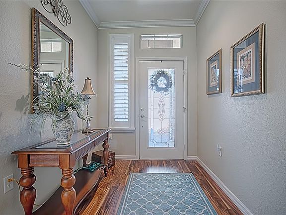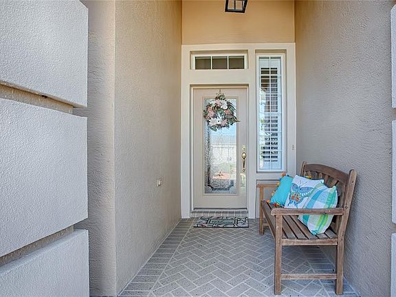 This 3/2 Santa Rosa is Pristine and loaded with upgrades. Enter through the beautiful leaded glass front door onto Engineered wood floors. The kitchen, laundry room and bathrooms have ceramic tile floors with the rest of the home other than the lanai, having the same engineered wood floors. The latest in stainless appliances are in the kitchen, plus granite counters, tile backsplash, crown molding, plantation shutters, large dinette, and all this plus an island. The Great room has crown molding and plantation shutters. The master bedroom has plantation shutters, bay windows and engineered wood flooring,ensuite has a seamless glass shower, with a water closet and a linen closet. How about the garage being extended to 29 feet, with a privacy screen,pull down stairs,keyless entry. Other fine features include wonderful landscaping, lots of privacy, a tankless hot water system, termite bond, screened lanai, stucco knee wall, with roller shades and a designer painted floor. This fine home also has furniture available. NEW ROOF 2021. HVAC new 2015 Make plans to see it today before it is gone.