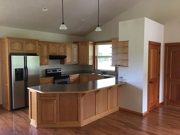 Newer custom home in the country, 3-car garage, open floorplan, gorgeous views This custom country home, close to the city, has it all. The kitchen has stainless appliances, and opens into the large great room with a high vaulted ceiling. There are incredible views through the picture windows throughout. The master suite features wall sconces, a huge walk-in closet, a luxuriously large bathroom, and extra cabinet storage. The other two bedrooms each include a built-in bookshelf and desk. There is an attached three-car garage, with a double-bay door in front, and a full third bay behind with an overhead door on the side of the house. There is a very wide paved area beside the garage for projects or toy storage, in addition to the main driveway. Also, the mudroom is just inside the garage with a utility sink with ample counter space, and washer/dryer hookups. The yards are in excellent shape, and we are looking for someone willing to maintain them. There are no pets or smoking anywhere on the property.